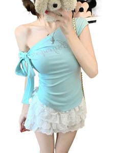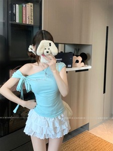 设计感斜肩绑带短袖T恤女夏季新款纯欲辣妹烫钻收腰短款露肩上衣