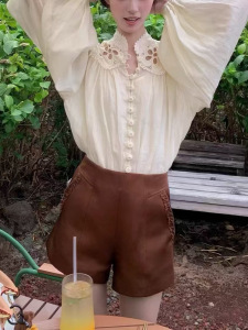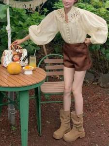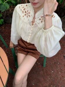 SourceWithU 刘亦菲同 苎麻镂空刺绣高质感棉麻长袖衬衫衣