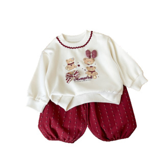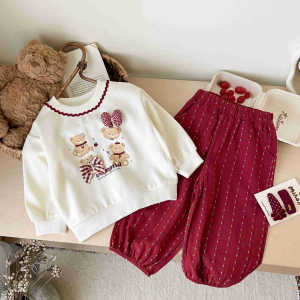 韩系女童秋季套装2025新款卡通小熊印花卫衣+酒红波点束脚运动裤