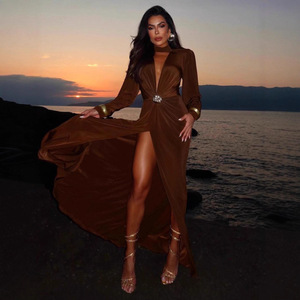 2025秋季新款跨境时尚深V高开叉长裙欧美风褶皱设计感礼服连衣裙