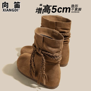牛皮版内增高小个子靴子女褶皱堆堆靴流苏中筒靴骑士靴勃肯短靴子