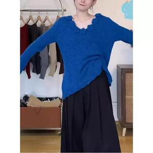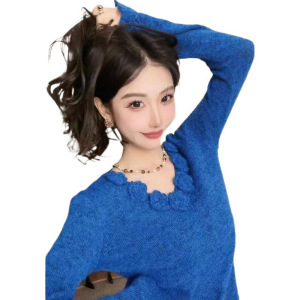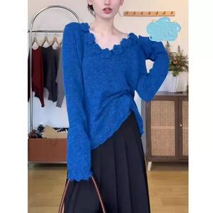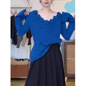 多巴胺蓝色立体花朵针织衫女秋冬软糯马海毛打底毛衣别致漂亮上衣