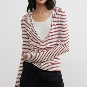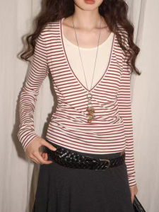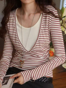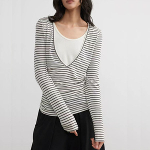 素舶 莱赛尔羊毛混纺柔软亲肤条纹撞色收腰捏褶假两件长袖上衣