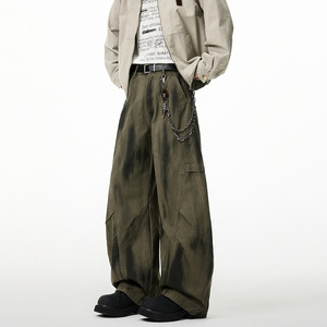 Mz小众设计感宽松褶皱拼接做旧牛仔裤男潮牌休闲阔腿廓形弯刀裤