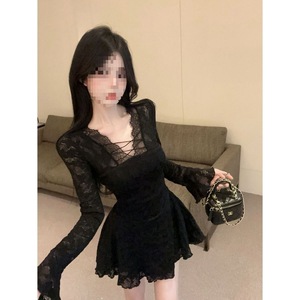 韩系纯欲风领长袖蕾丝连衣裙2025春季新款收腰显瘦字短裙女