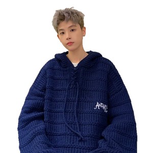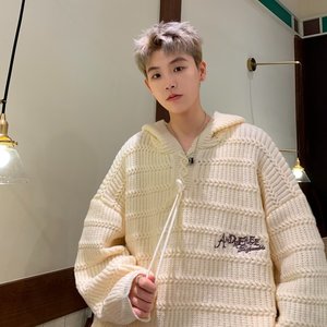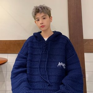 2025秋冬新款套头毛衣美式复古休闲慵懒风连帽V领针织衫男纯色