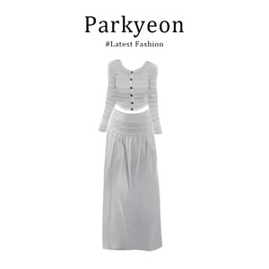 法式少女风修身纽扣长袖上衣高腰休闲显瘦半身裙两件套女