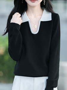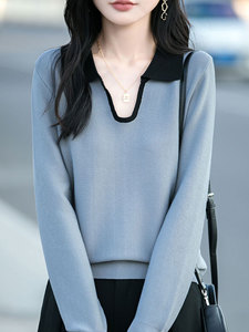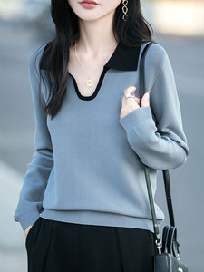 【厂家直供】秋季新款翻领针织上衣女拼色宽松百搭显瘦毛衣打底衫