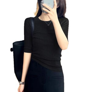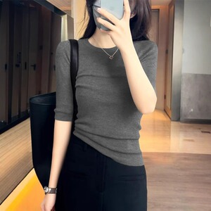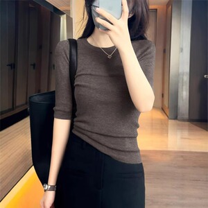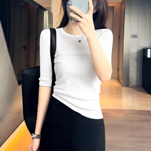 日常简约圆领短袖上衣女装夏季新款时尚修身五分袖气质针织打底衫