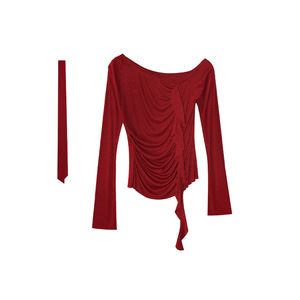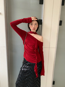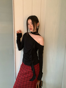 诠释美 NEWOPEN 25秋法式甜辣不规则设计长袖露肩t恤上衣女F6521