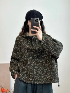 古咖服饰秋季新款复古棉麻印花连帽外套女文艺碎长袖宽松套头上衣