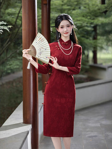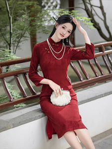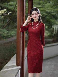 新中式旗袍红色单层气质修身旗袍裙长款七分袖包臀高开叉连衣裙