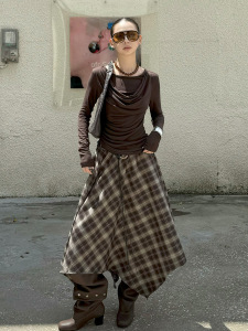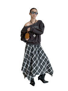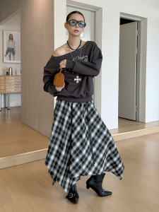 MMFISH时髦街头设计感低腰不规则编织腰带撞色格纹中长裙25Q501