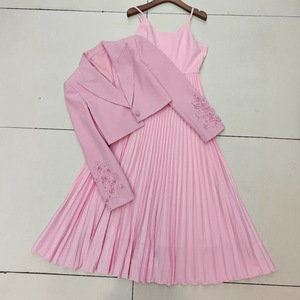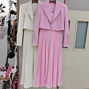 2025秋季长款A字半裙短款长袖开衫上衣两件套亚马逊新款气质百褶