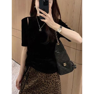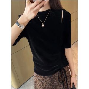 欧货时尚半高领抽绳褶皱五分袖丝绒t恤女款2025新款爆款休闲上衣