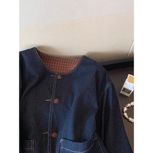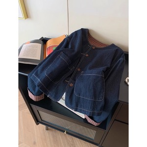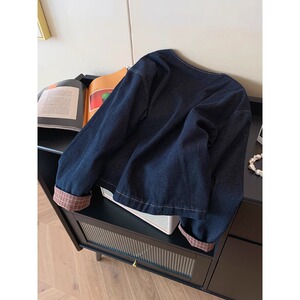 小香风格纹拼接圆领牛仔外套女春秋季宽松小个子休闲短款夹克上衣