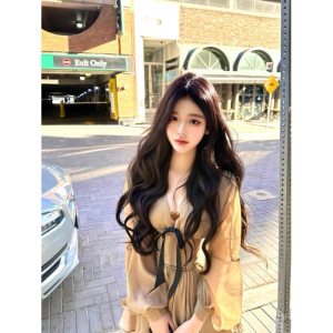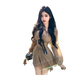 法式名媛风蝴蝶结V领长袖雪纺连衣裙女秋季收腰显瘦气质A字短裙子
