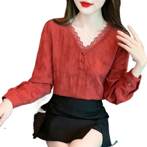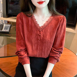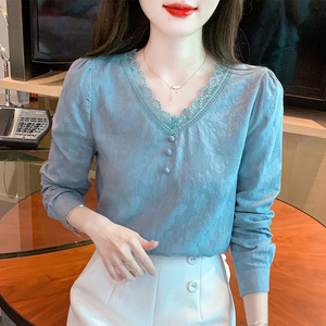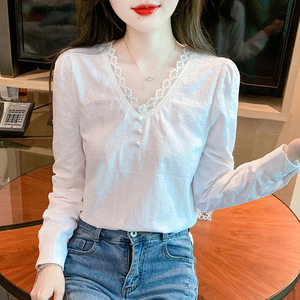 2025年春春秋女装新款蕾丝V领纯棉衬衫女洋气提花遮肚子长袖上衣