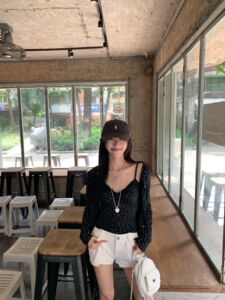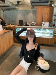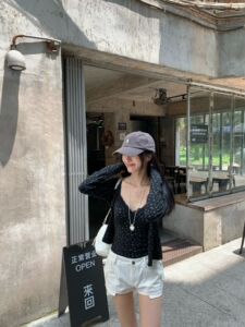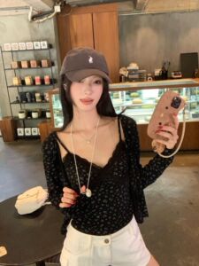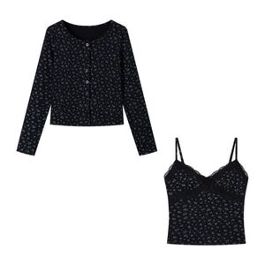 甜辣妹套装黑色碎花长袖开衫短款小外套女秋季吊带背心韩系两件套