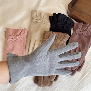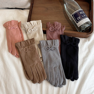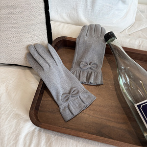 韩版时尚德绒手套女士秋冬季百搭蝴蝶结花边开车骑行遛弯防风全指
