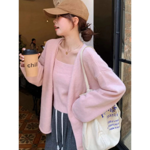 蓝色长袖软糯针织开衫女秋季2025新款韩系宽松慵懒风毛衣两件套