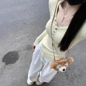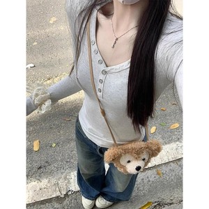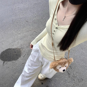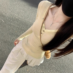 美式甜辣V领设计感小众长袖T恤女秋季新款小个子正肩修身显瘦上衣