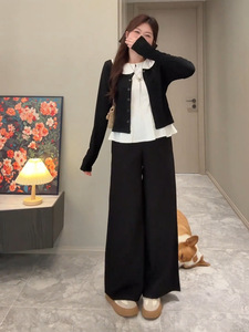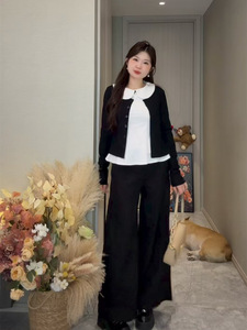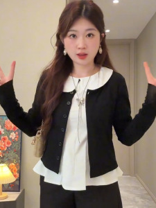 大码胖MM韩系慵懒风娃娃领内搭女早秋新款短款针织开衫减龄两件套
