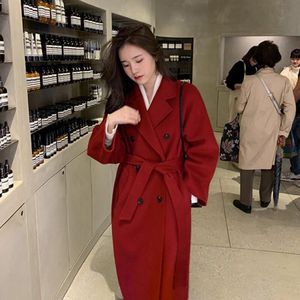 (350龙凤呢)秋冬新款经典双排扣毛呢外套中长款呢子大衣女
