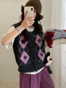 韩系复古风菱格撞色针织马甲女秋冬新款叠穿百搭背心开衫上衣1255