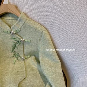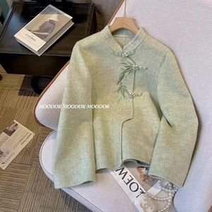 新中式小香风毛呢外套女秋冬短款轻国风刺绣绿色竹子毛呢上衣新款