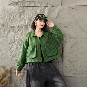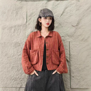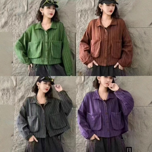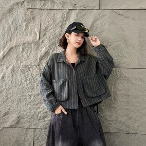 水洗棉条纹短外套复古文艺休闲大口袋翻领宽松百搭上衣1781