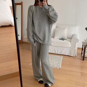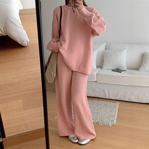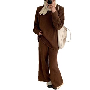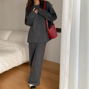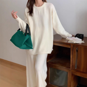 秋冬新款韩版休闲套头针织衫阔腿裤两件套宽松慵懒风温柔毛衣套装