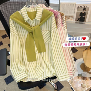 厂家直销假两件披肩女士长袖衬衫女春装春季新款宽松显瘦衬衣条纹