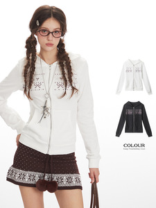 HeyHenry 美式正肩修身连帽开衫卫衣女秋季印花拉链内搭打底外套