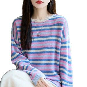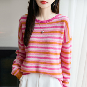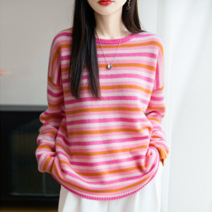 纯羊毛衫女式圆领针织打底多巴胺彩条纹设计感毛衣秋冬新款内搭衫