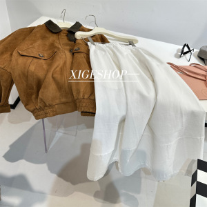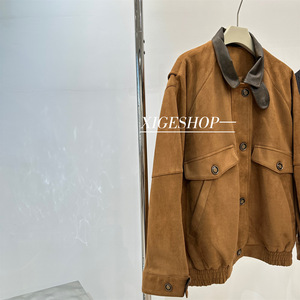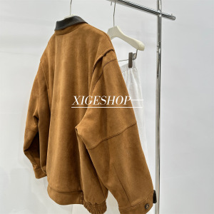 缪系中古感麂皮绒撞色拼皮翻立领外套女宽松洋气复古皮衣夹克秋季