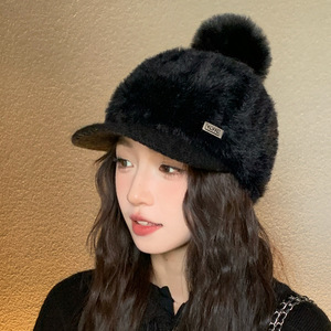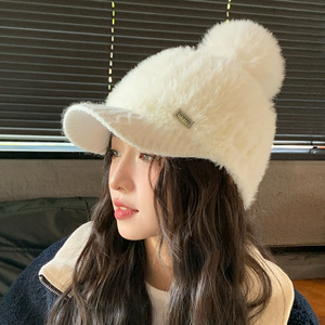 秋冬季帽子女款鸭舌帽护耳兔毛保暖帽韩系时尚百搭纯色针织毛球帽