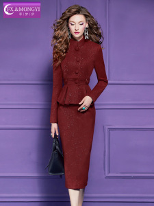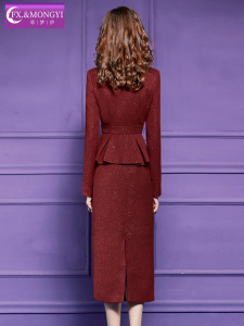 菲梦伊亮片红色毛呢套装女秋季高端优雅名媛荷叶边上衣职业半身裙