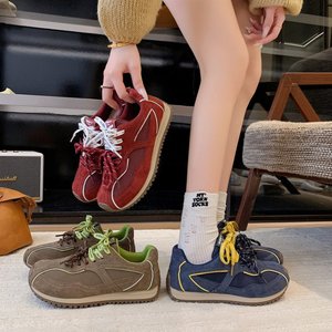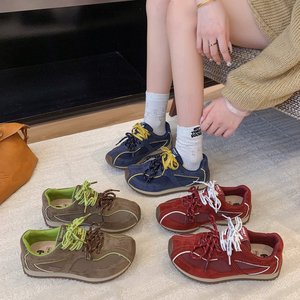 周雨彤同款真皮女鞋跳跳糖复古红色芭蕾德训鞋内增高休闲鞋子预