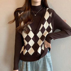 美拉德假两件菱格针织衫女秋冬新款显瘦上衣内搭半高领毛衣打底衫