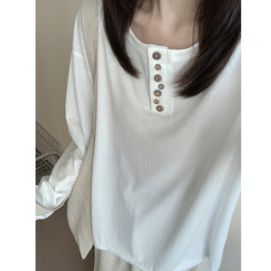 2025秋上新!不规则扣罩衫上衣女卷边设计感长袖休闲T恤圆领女装