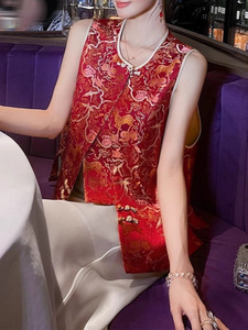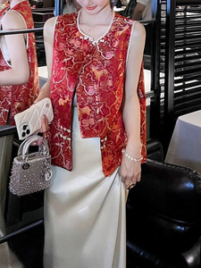 新中式富贵明艳红色大气国风圆领提花盘扣秋季精致无袖背心马甲