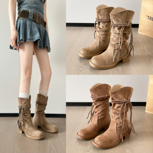 流苏麻绳粗跟中筒靴子女2025秋季新款复古风骑士靴绒面厚底时装靴