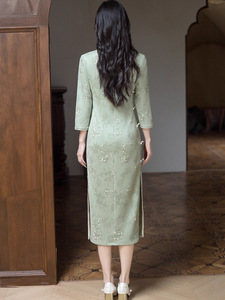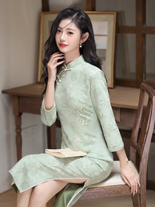 麂皮绒印花单层旗袍新中式年轻款绿色改良旗袍高开叉气质连衣裙