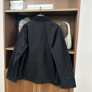 复古灯芯绒拼接翻领多口袋黑色牛仔外套