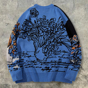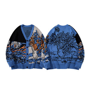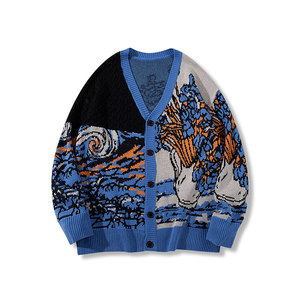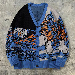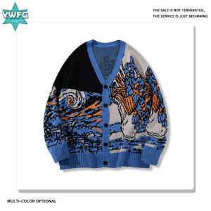 YWFG复古油画风景毛衣开衫男2025秋冬宽松百搭情侣V领长袖针织衫