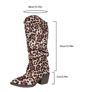 2025秋季新款豹纹欧美套筒高跟骑士靴大码褶皱粗跟尖头女士西部靴