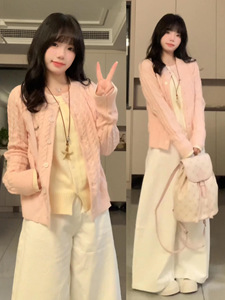 粉色假两件针织开衫女秋季新款软糯慵懒风高级感韩系穿搭毛衣外套