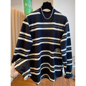 【胖妹妹】春秋新款高级感条纹长袖t恤女百搭休闲圆领松弛感上衣