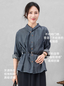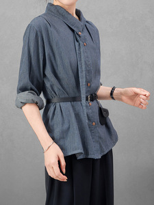 云长 蓝色不规则长袖衬衫女秋季新款棉类混纺配腰带韩系上衣批发